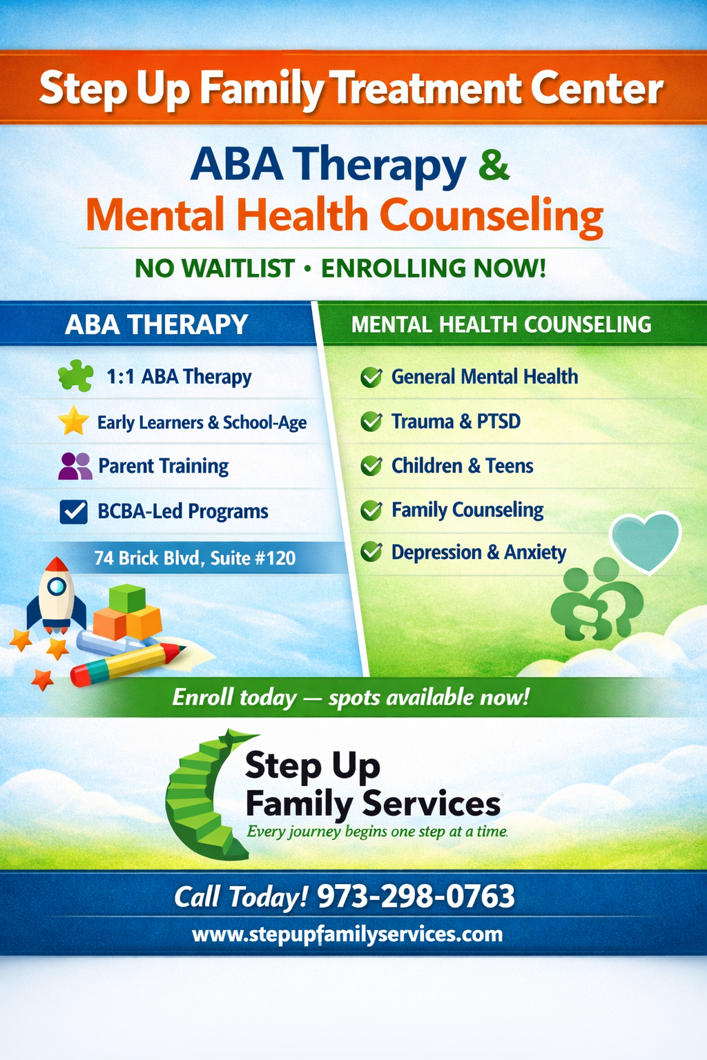 Due to increased demand and our commitment to providing high‑quality Applied Behavior Analysis (ABA) services, Step Up Family Services is expanding ABA operations into a larger, dedicated space at 74 Brick Blvd., Suite #120.